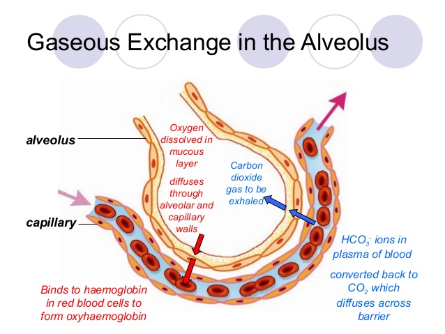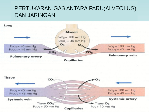 Oksigen masuk waktu kita bernafas, dan sampai di alveolus(bagian terkecil paru). Di alveolus terjadi pertukaran O2 dan CO2, tepatnya terjadi antara dinding alveolus yang dilapisi surfaktan dan dinding pembuluh darah. Mekanisme ini terjadi karena adanya gradien tekanan O2 antara alveolus dan pembuluh darah.