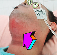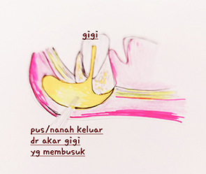 - PEMERIKSAAN FISIK: kesadaran menurun, pasien tampak lemah & pucat, Tensi: 70/50 mHg (artinya syok), Nadi: 114x/menit(normal ±80X/menit), Suhu: 38,8C, Pernafasan: 28-32X/menit (normal 16-20X/menit). Dibawah dagu tampak pembengkakan, seperti bisul yang mau meletus (contoh seperti gambar).