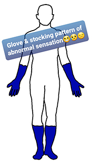 Bentuk dari neuropathy seperti mati rasa ini dimulai dari jari-jari & makin naik sampai proximal kaki, sehingga pasien merasakan sensasi yang abnormal pada kaki & tangan (glove and stocking pattern of abnormal sensations), lihat gambar.