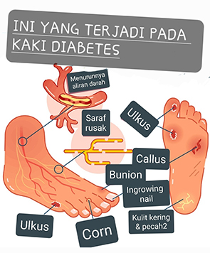 DPN menjadi faktor utama yang menyebabkan kaki kehilangan sensasi nyeri, luka akibat garukan sering tidak disadari & akhirnya menjadi luka terbuka. Luka diabetes awalnya sering berupa ulkus pada kaki, yang berujung pada amputasi karena terjadi osteomyelitis (infeksi tulang). Ulkus artinya luka yang melibatkan seluruh ketebalan kulit, diperkirakan 45% s/d 60% ulkus pada pasien diabetes disebabkan neuropathy.