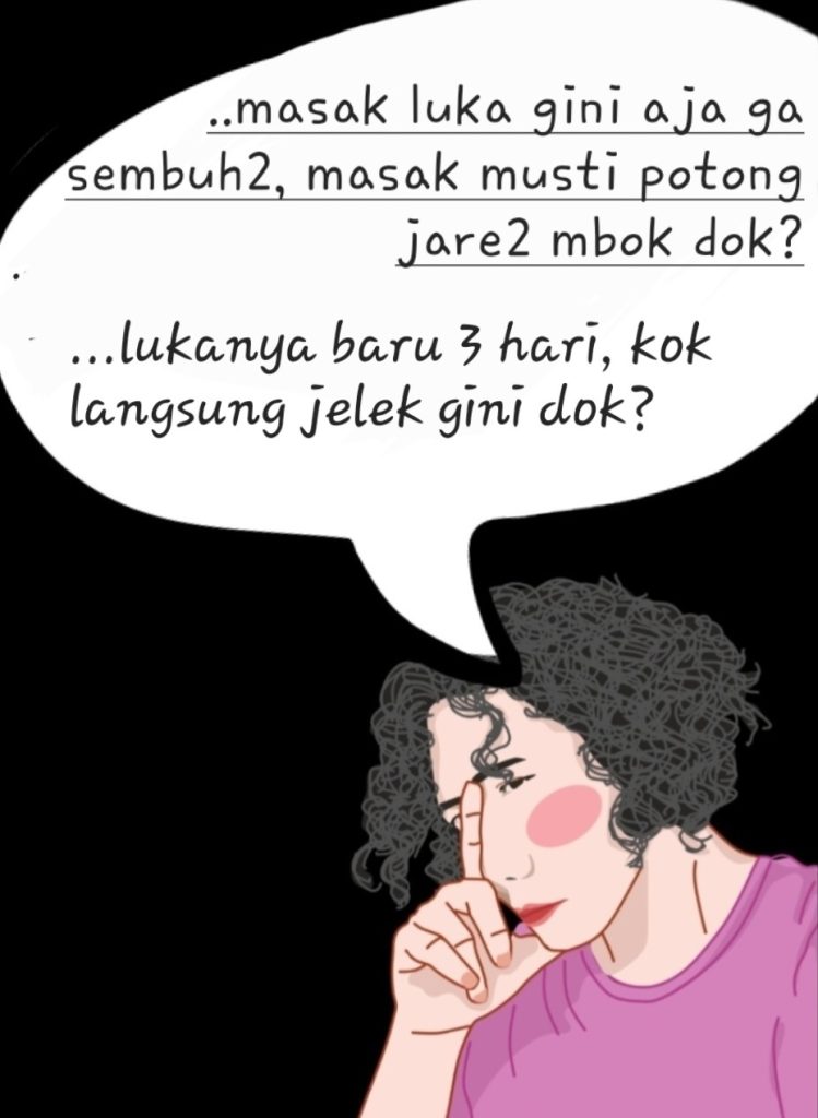 Pokoke yang bener itu benernya PANTANG TIMBUL LUKA PADA PASIEN DIABETES. Cerita dibalik luka itu sebenernya yang harus diantisipasi, kalau udah ada luka, ini adalah ujung dari cerita panjang DPN & PAD tadi, naaa kalau proses ini sudah berlangsung tahunan, bagaimana membalikkannya dalam sehari, wkwkwk?.